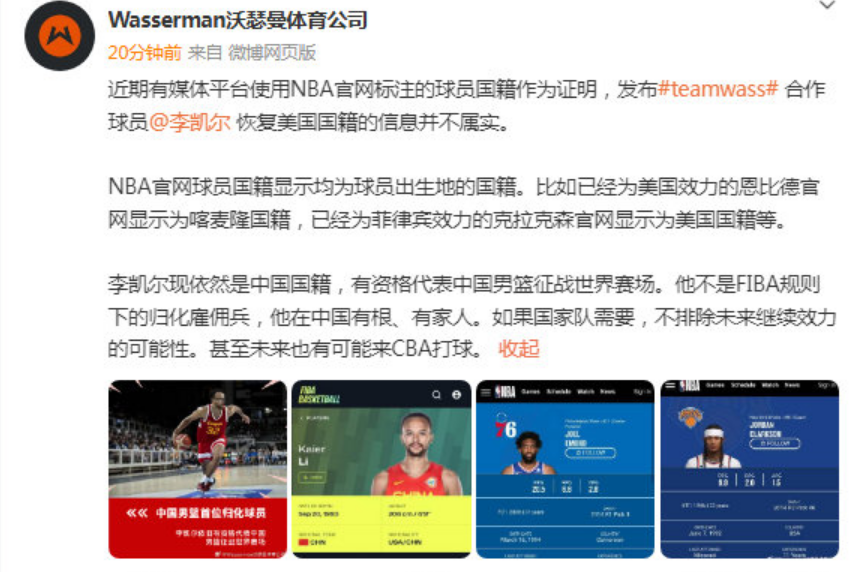 对此,如今李凯尔的经纪公司Wasserman发布官方声明表示:“近期有媒体平台使用NBA官网标注的球员国籍作为证明,发布李凯尔恢复美国国籍的信息,并不属实。”