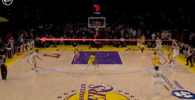 下个回合,约基奇再次展现了自己恐怖的球场视野。湖人把防守资源几乎全部倾斜在约基奇身上,把约基奇逼到了右侧边线的位置。但约基奇一记超级大对角传球,传给了底角的哈达威,后者命中三分再次反超。